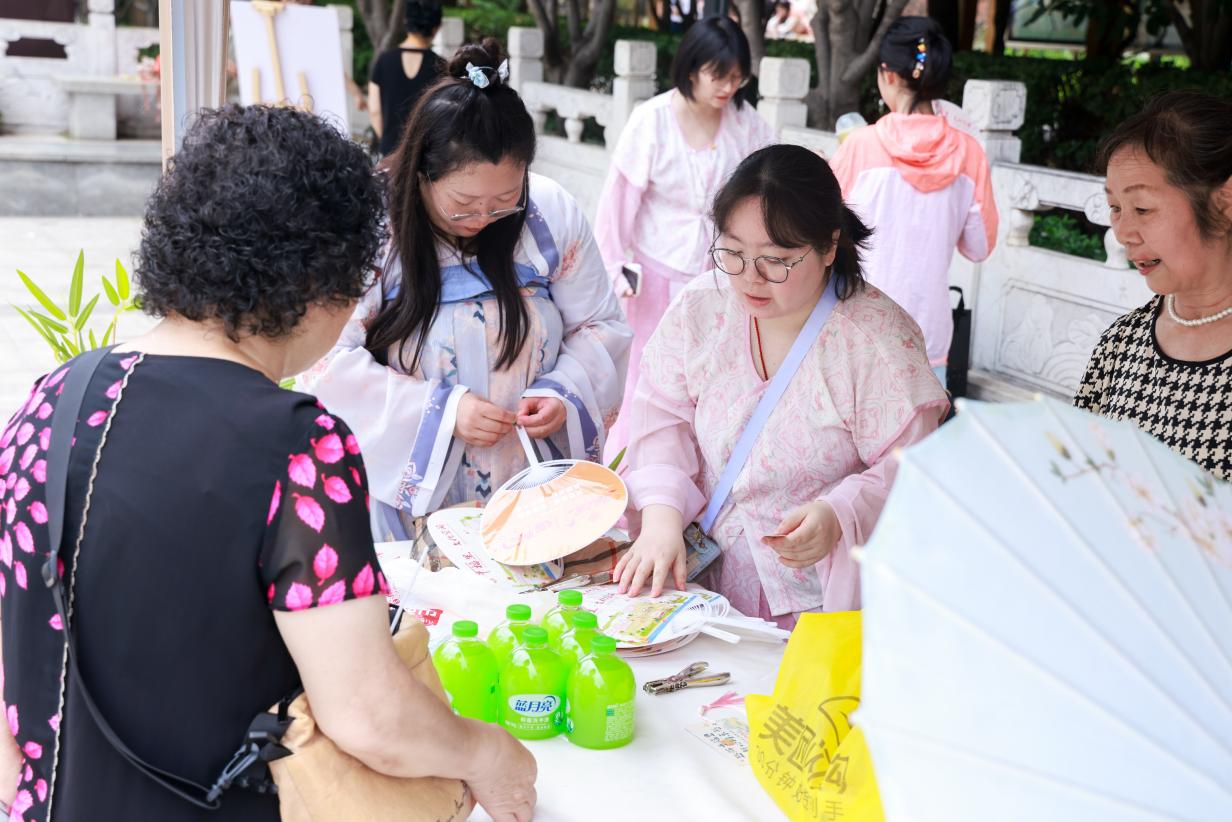 除了专家义诊,游园会现场还准备了多项丰富多彩的活动,热闹非凡。三伏贴教学站前,健康管理师演示同仁堂定制艾草三伏贴的穴位贴敷技法,数百份体验装被争相领取;非遗手工区里,邀请非遗传承人现场制作糖画、竹编蚂蚱,体验非遗精湛制作工艺;“司机之家”急救包、休闲茶棚、留言墙等特色场景同步开放,搭配游园人员身着古装,进行DIY手作漆扇绘制、驱蚊香囊制作、套圈大西瓜等系列趣味项目,真正实现“老少同乐、健康共享”。很多居民感慨:“原来健康讲座可以这么好玩,原来保险服务就在家门口。”